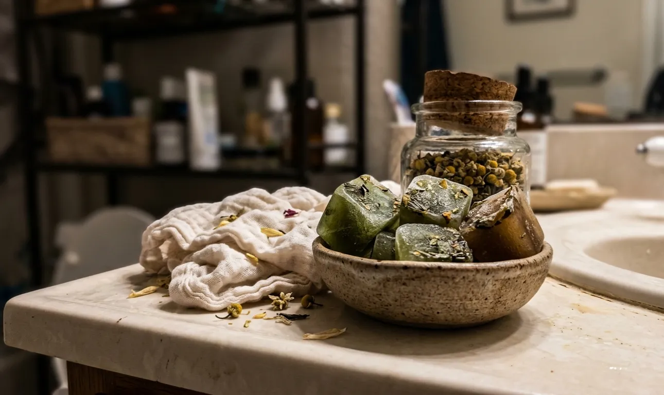 Strofinare il viso con cubetti di ghiaccio preparati con decotto di camomilla